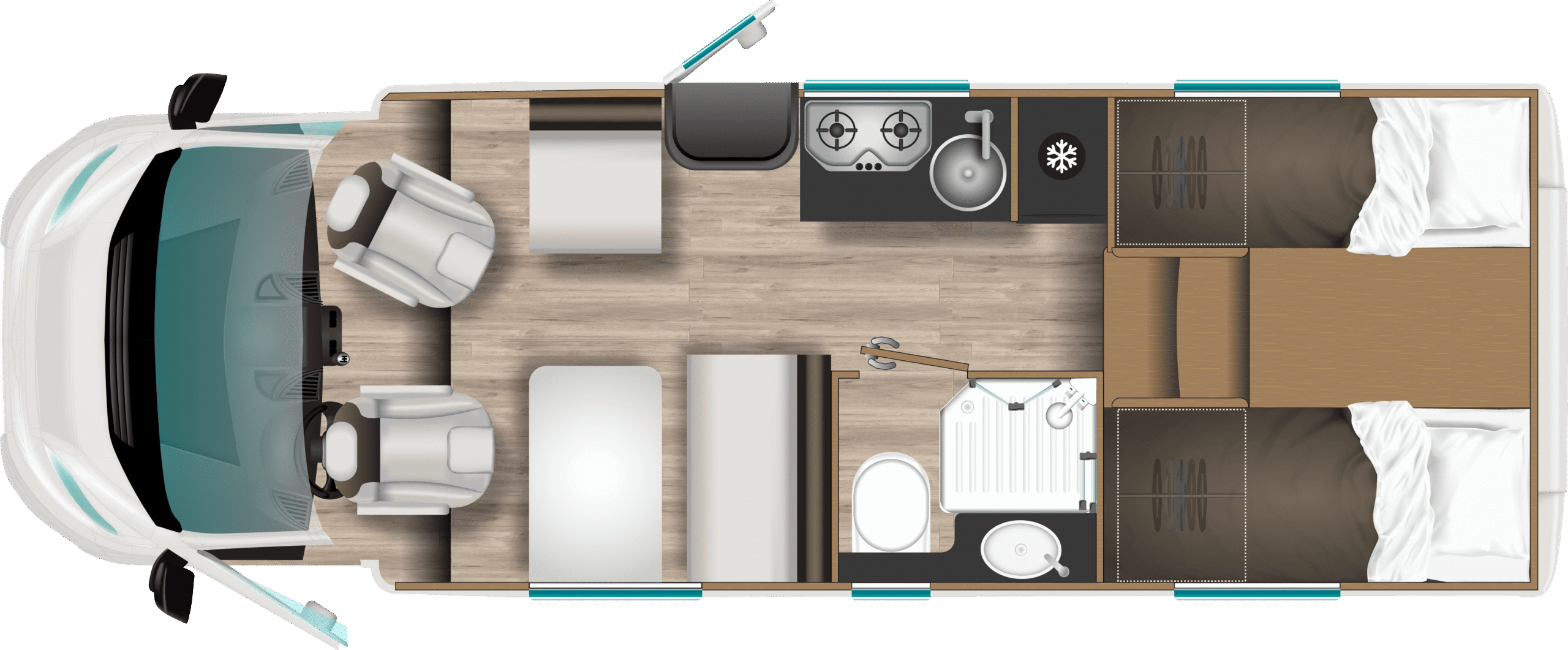 • Camas gemelas traseras (82 x 195 cm + 77 x 190 cm) transformables en cama XXL de hasta 220 cm