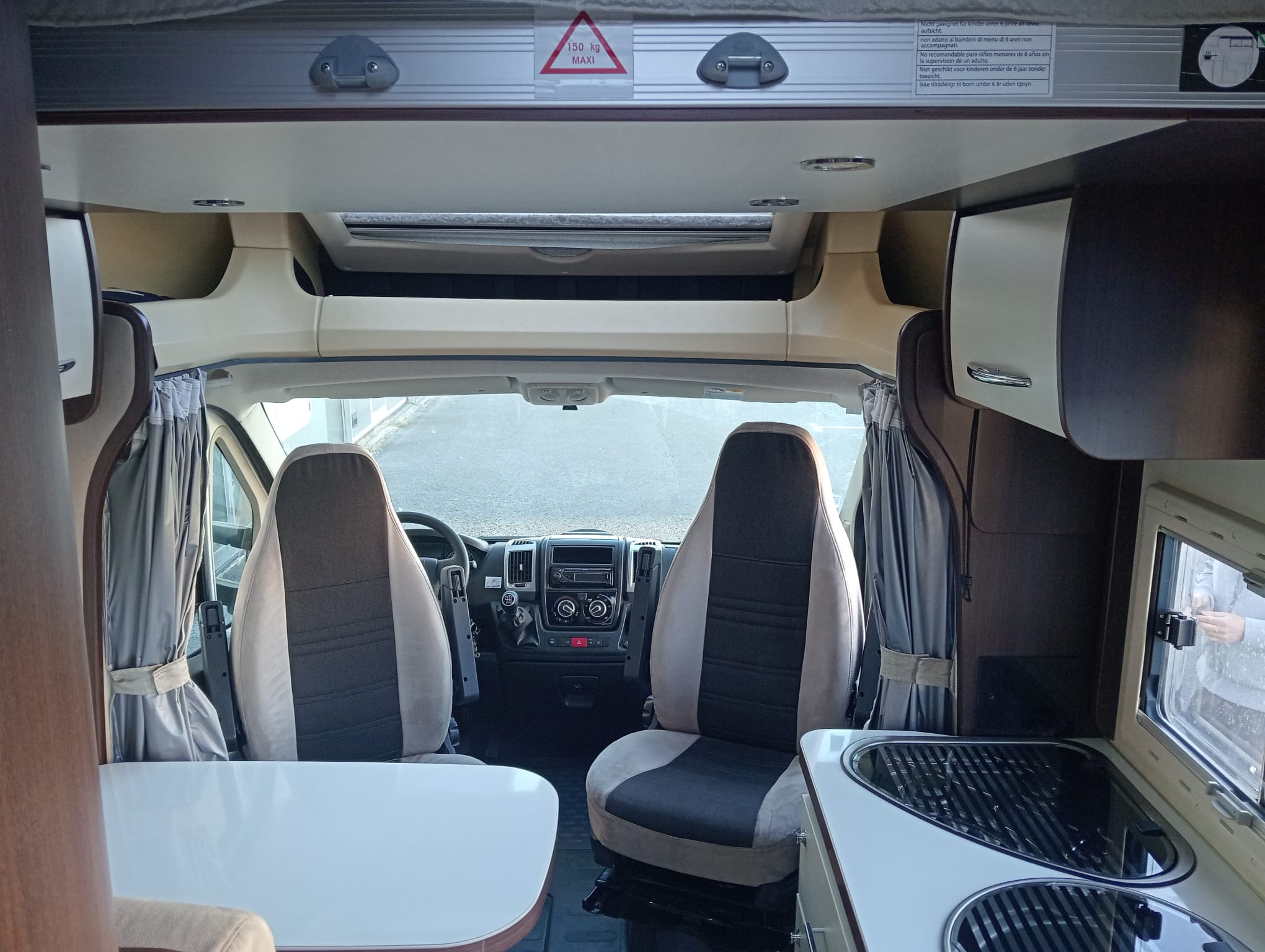 La zona de día es amplia y luminosa gracias al techo panorámico en cabina, que aporta luz natural y una agradable sensación de amplitud. Todo está pensado para hacerte sentir como en casa, vayas donde vayas.