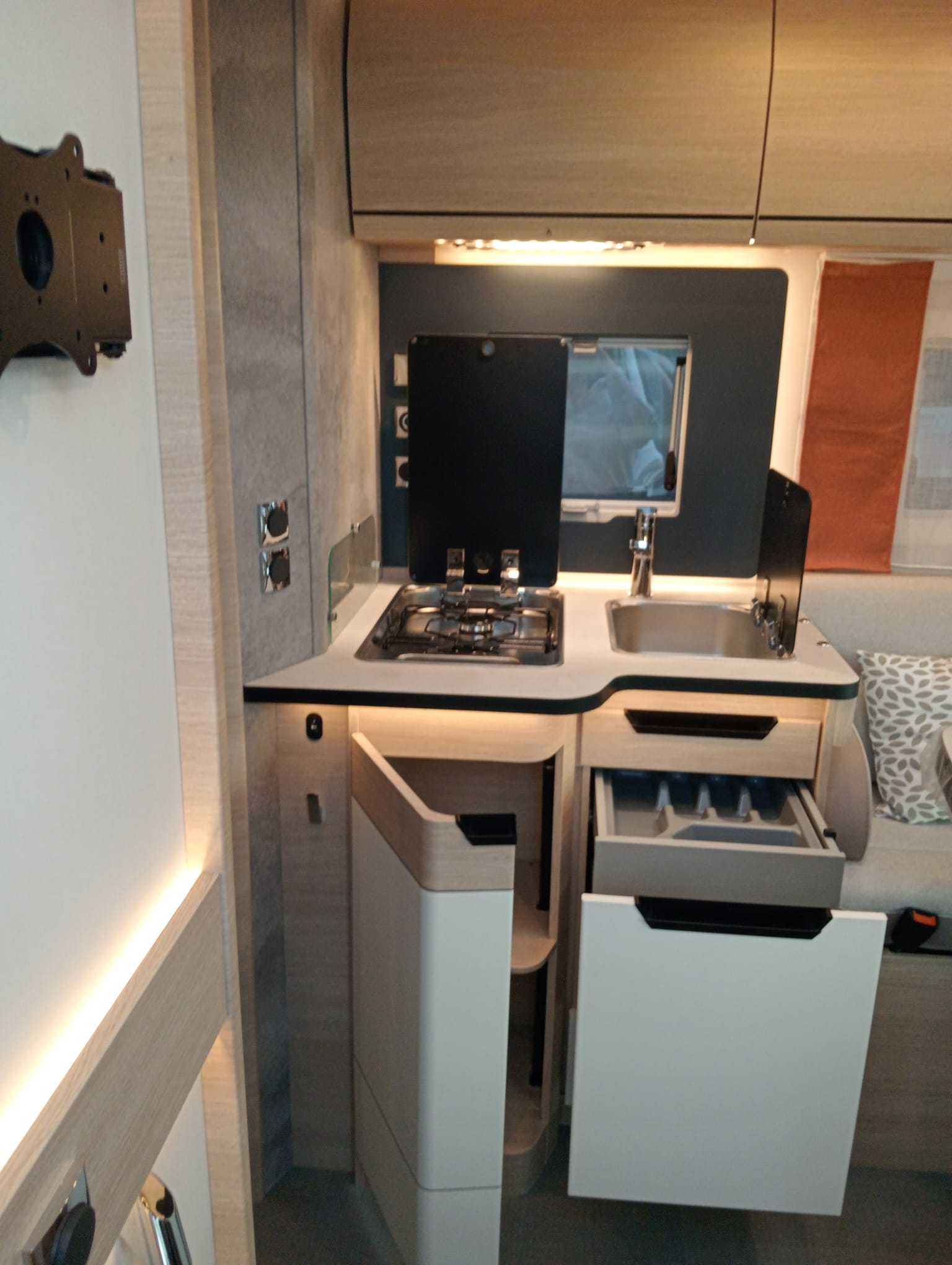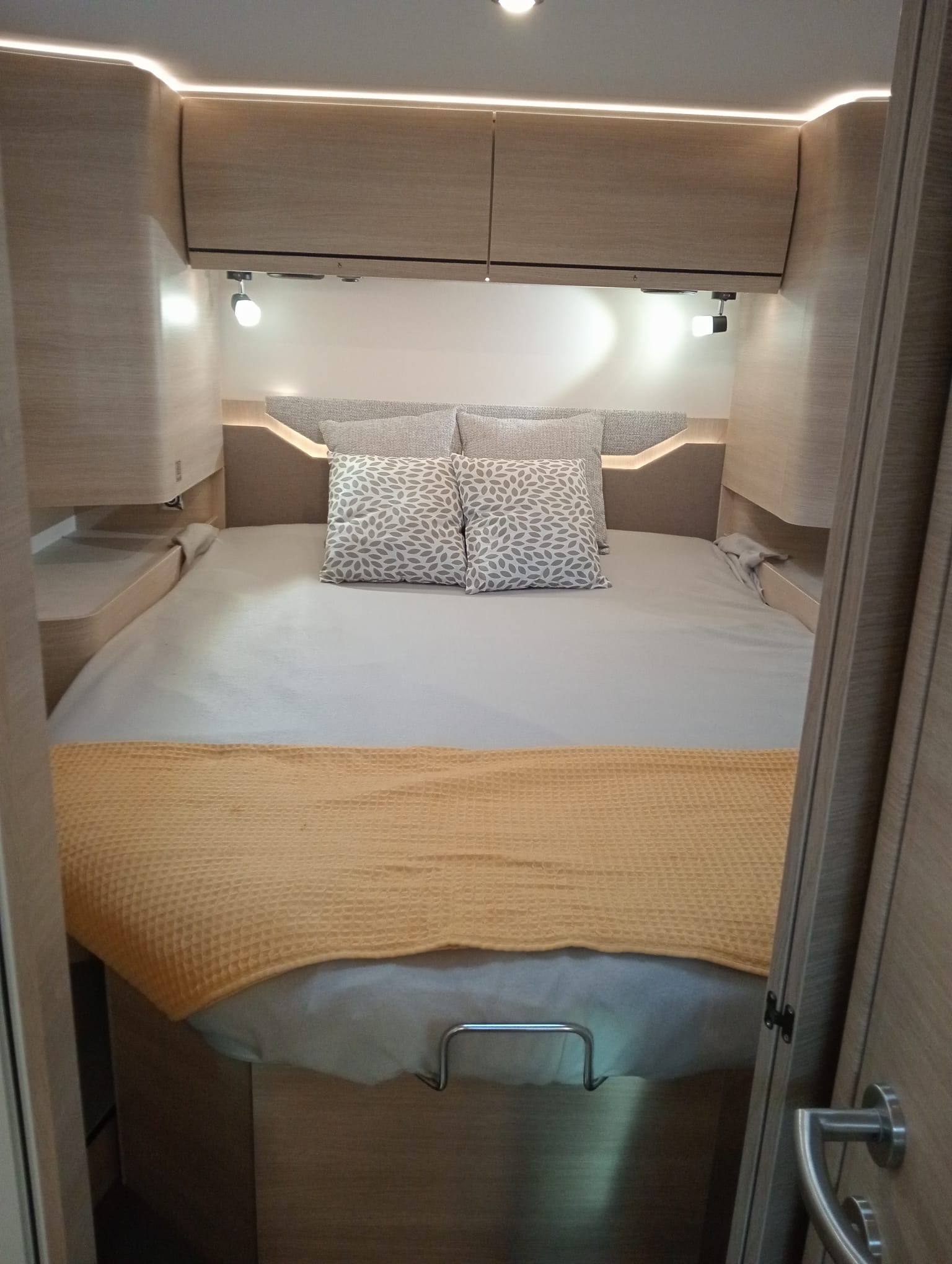 El interior de la RAPIDO C86i refleja un estilo elegante y funcional. La tapicería Alicante aporta un toque sofisticado, mientras que el mobiliario Luceo ofrece acabados modernos que crean un ambiente acogedor y práctico. Cada detalle ha sido pensado para maximizar el confort, desde la distribución hasta los materiales empleados.